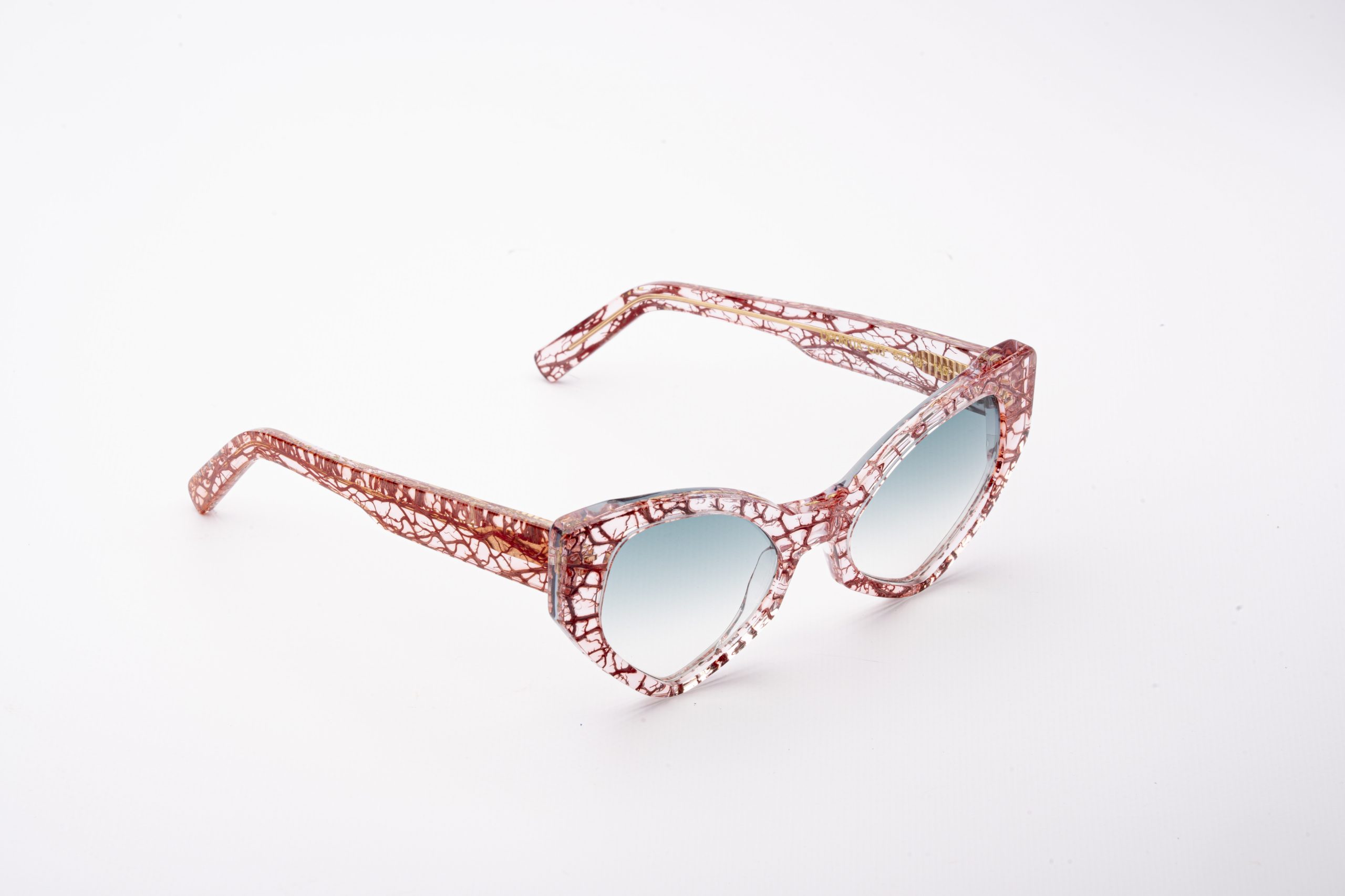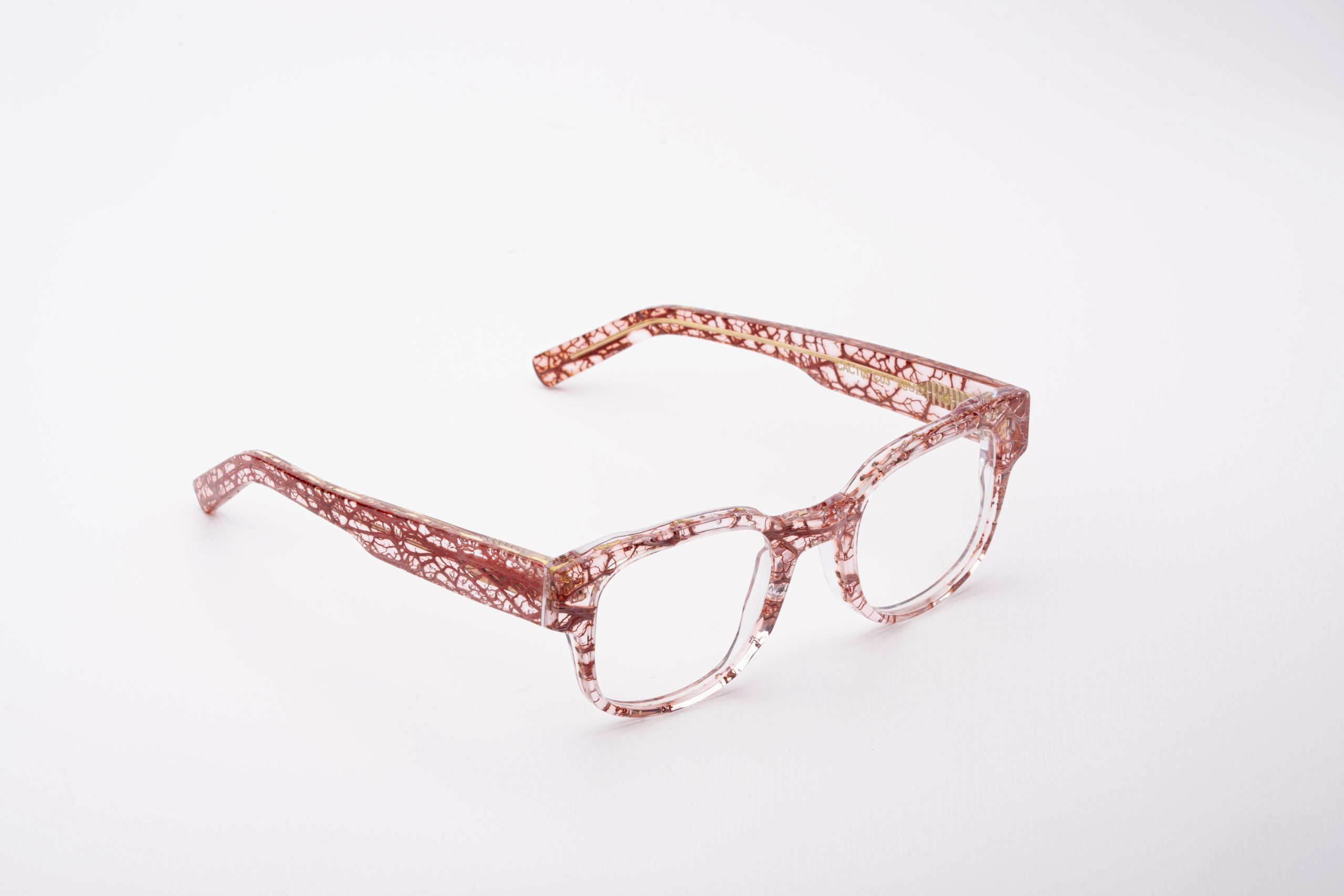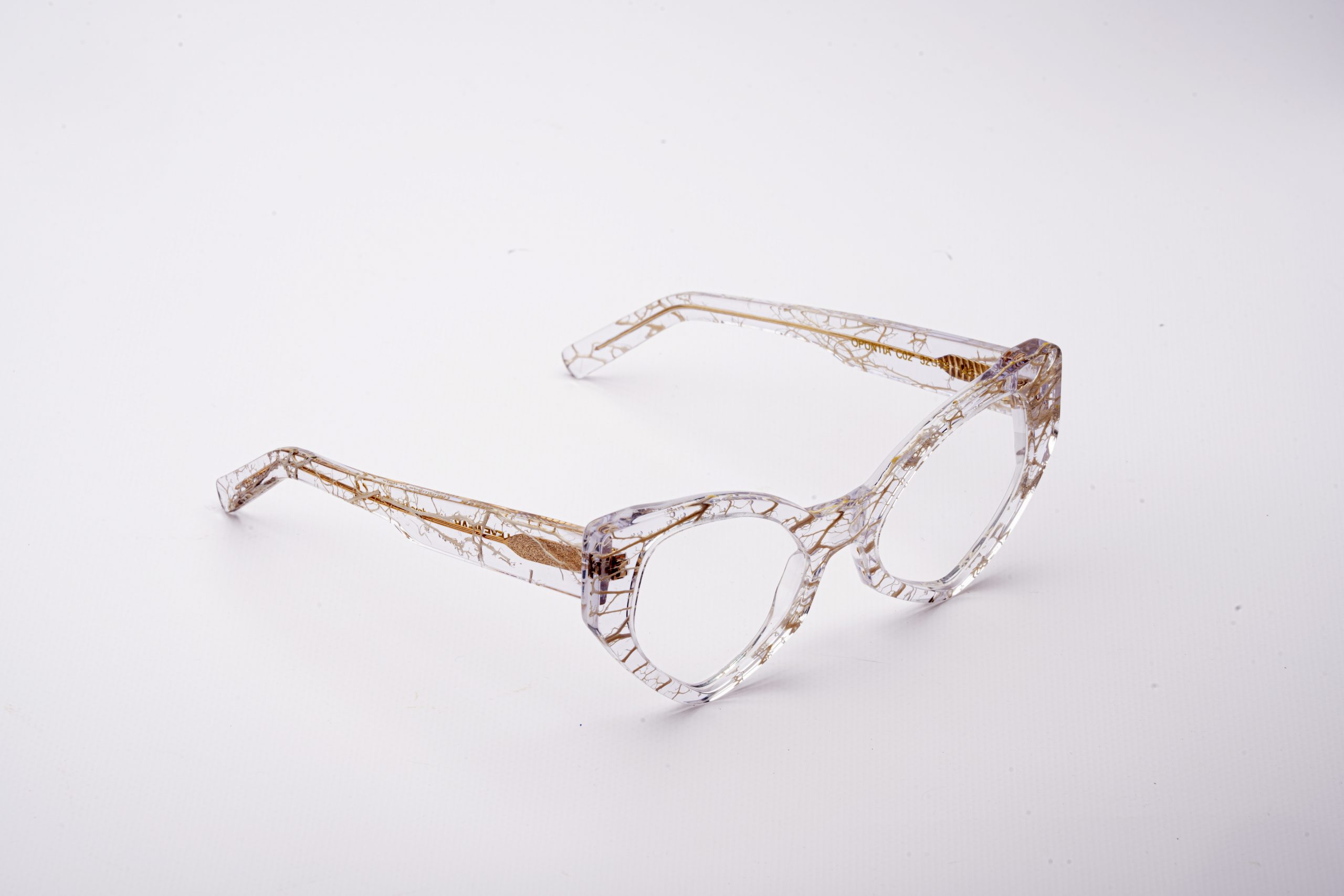 Occhiali realizzati tramite processo artigianale di raccolta, pulitura e colorazione della fibra della pianta del fico d’india. Successivamente la fibra viene inglobata, attraverso uno speciale processo di incollaggio, all’interno di lastre di acetato di cellulosa Mazzucchelli.